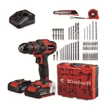 El taladro atornillador percutor con batería Einhell TE-CD 18/40 Li-i +64 (2x 2,0Ah) está equipado con una potente caja de cambios de dos velocidades y un par de 40 Nm que permite un gran rendimiento al taladrar y atornillar. Así, el taladro atornillador alcanza una frecuencia de percusión de 6.400 en la primera marcha y 24.000 en la segunda. Este taladro atornillador pertenece a la familia Power X-Change y ofrece las ventajas de las baterías de iones de Li combinables y eficientes.